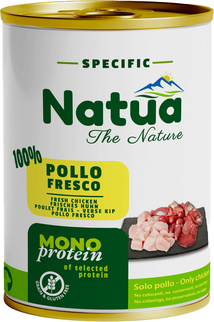 Poulet frais 70% – Bouillon de poulet 28,9% – Substances minérales 1% – Huile de lin 0,1%